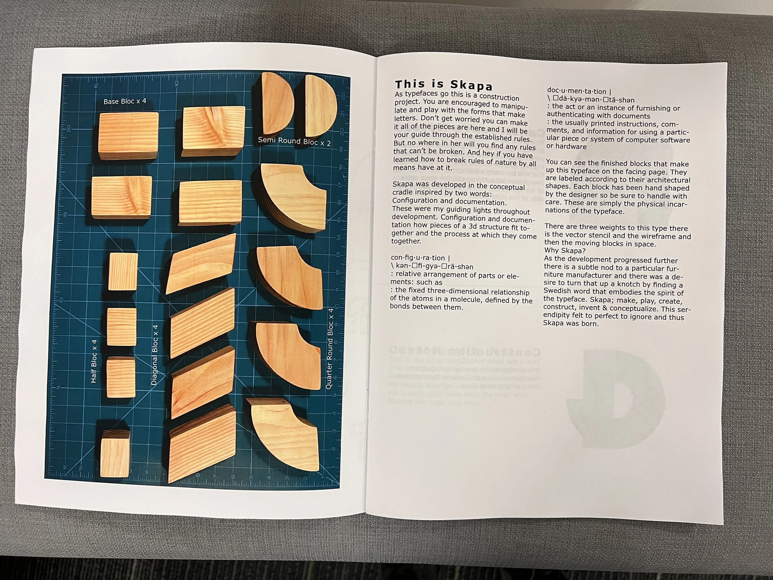 As typefaces go this is a construction project. You are encouraged to manipulate and play with the forms that make letters. Don’t worry you can make it! All of the pieces are here and you will be guided through the established rules. Nowhere will you find any rules that can’t be broken. And hey if you have learned how to break rules of nature by all means have at it. Skapa was developed in the conceptual cradle inspired by two words: Configuration and documentation. Each block has been hand shaped by the designer so be sure to handle with care. These are simply the physical incarnations of the typeface. There are three weights to this type there is the vector, the wireframe and the physical blocs.
